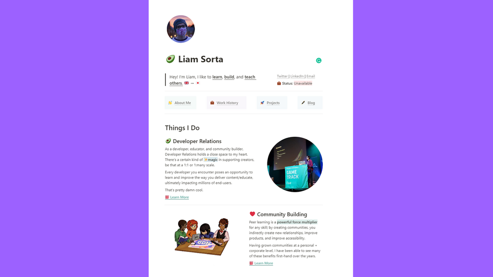 Whether you're open for work or happily employed, having a great personal website makes it easier for you to meet interesting people, showcase what you do, and maximise your opportunities.
